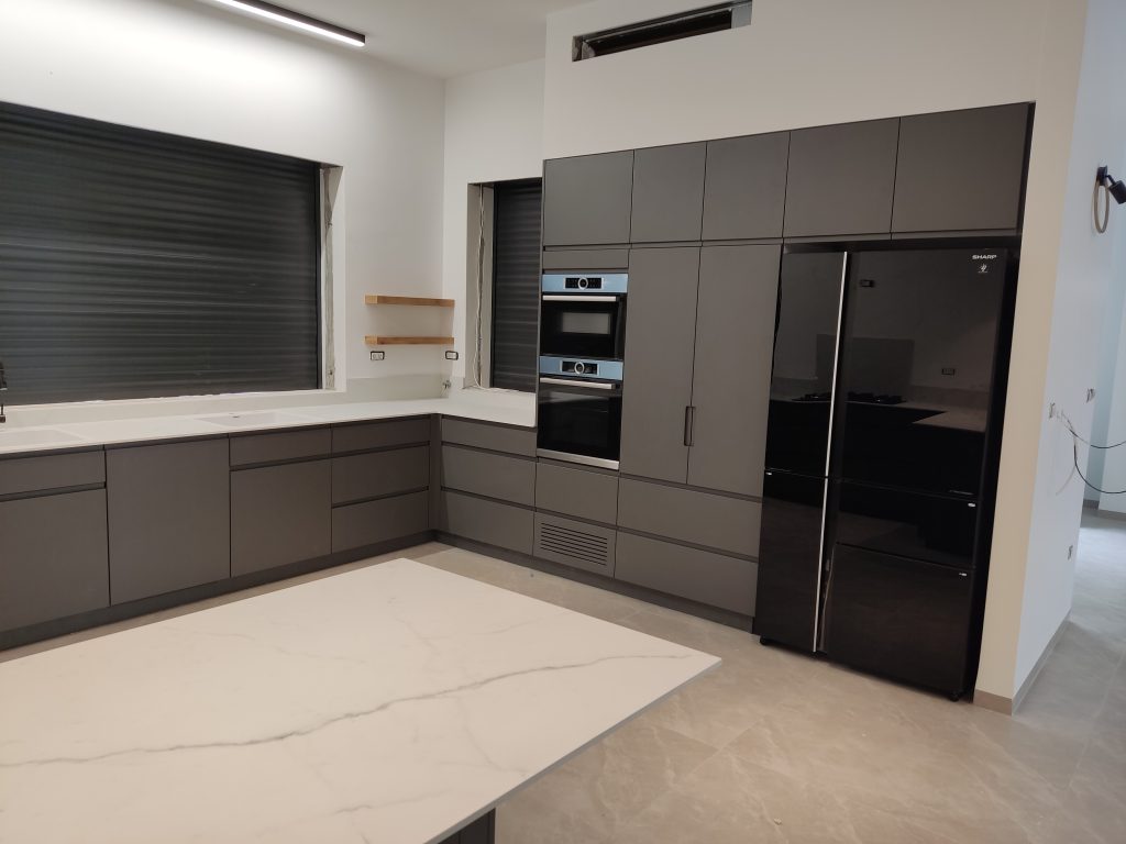 מטבח אפור גרפית מודרני עיצוב נקי ידיות אינטגרליות